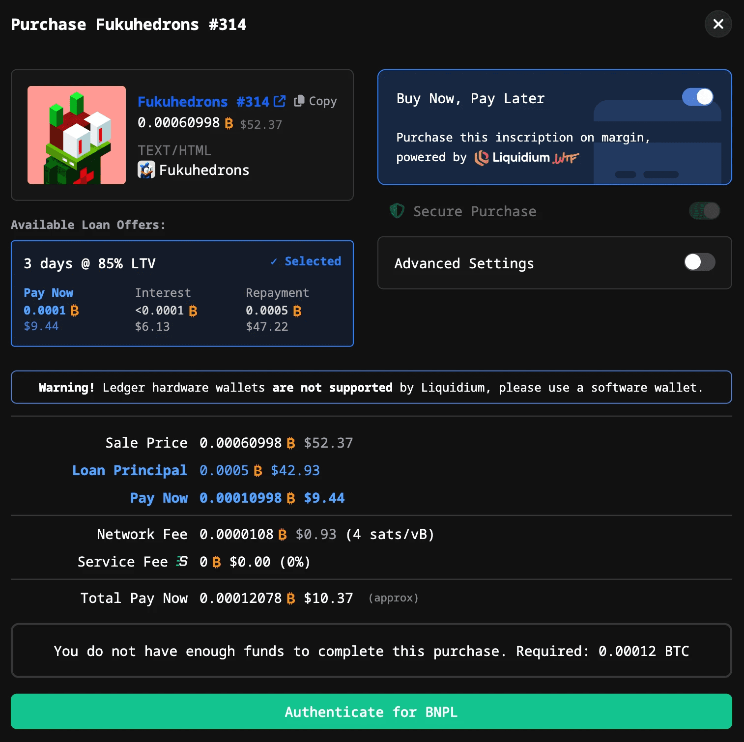 One example of BNPL adoption is Liquidium.WTF’s integration with Satflow, which enables instant purchasing power for Ordinals without requiring buyers to pay the full price upfront. At checkout, buyers can finance part of the purchase using an instant loan, while sellers receive full payment immediately